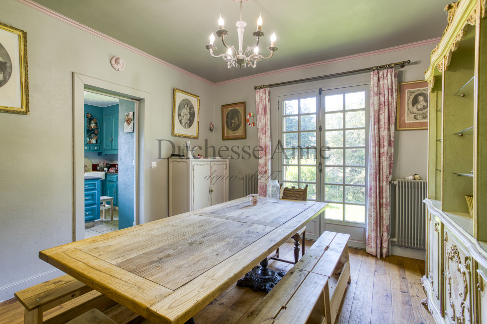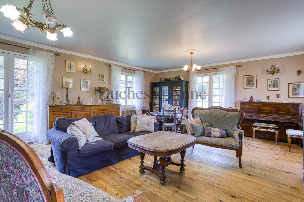 Entrée desservant beau salon (parquet) de 41 m², salle à manger (parquet) 13.60 m², cuisine équipée 13.90 (sol en pierre), chambre 13.92 m² et salle de bains récente. Wc, buanderie.