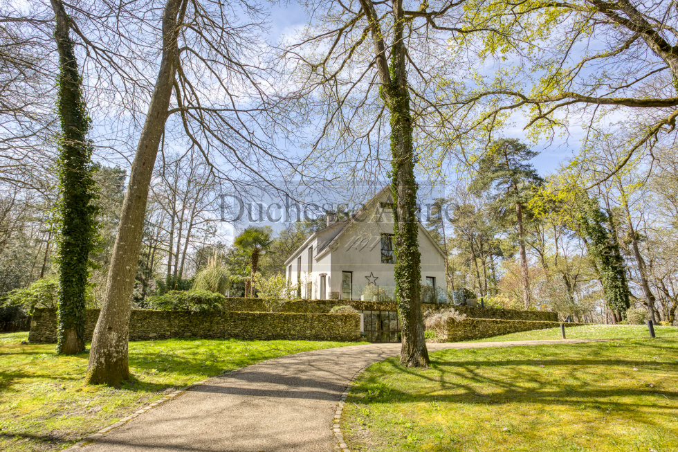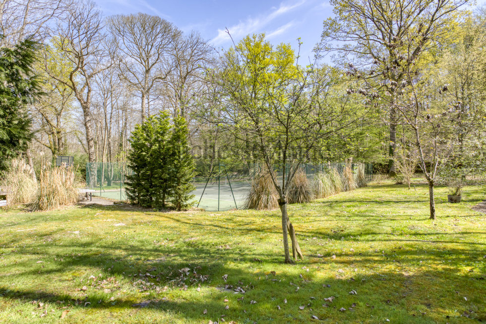 Propriété entièrement rénovée de 450 m² environ au cœur d’un parc boisé de près d’1 hectare avec tennis en lisière de forêt, au calme et à proximité du centre du village. Entrée spacieuse et vitrée donnant sur les espaces de réception (80 m²) comprenant une cuisine ouverte avec grand ilot central sur salle à manger et séjour avec cheminée centrale, dégagement vers cellier, buanderie et wc, espace parental de plain-pied avec chambre, dressing, wc indépendants et salle d’eau. Accès aux étages et au sous-sol total par un magnifique escalier à vis en béton ciré. Au 1er, dégagement vers wc, salle de bains, et 5 chambres spacieuses dont 2 avec salle d’eau/bains, wc et dressing. Au 2nd étage, palier vers très grand dressing et 2 chambres supplémentaires ou salle de jeux. Sous-sol total de 150 m² comprenant grand garage (65 m²) pour plusieurs véhicules, pièce home-cinéma (32 m²), salle de sport (22 m²), cellier/cave, chaufferie et dégagements. Matériaux de grande qualité (parquets chêne, béton ciré, huisseries en métal double vitrage…), décoration raffinée, très nombreuses ouvertures vitrées donnant sur le parc, beaucoup de rangements/placards intégrés. Une maison saine (planchers chauffants, pompe à chaleur...). Bonne exposition, lumière traversante, grande terrasse surplombant le parc et le tennis. Accès direct et à pied de la forêt bordant la propriété et au centre de Montfort l'Amaury, ses commerces et ses écoles.