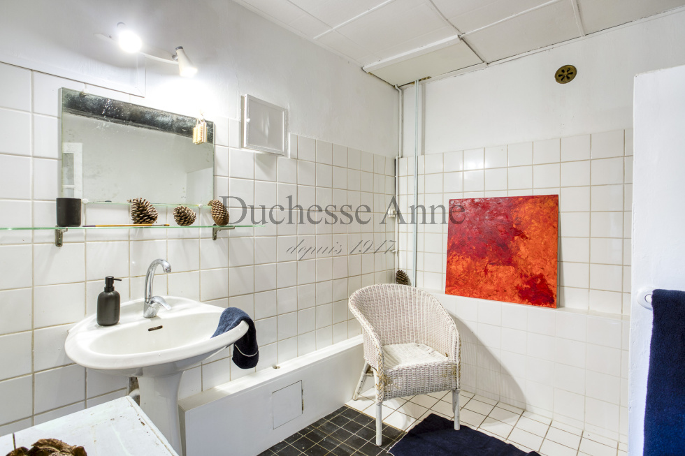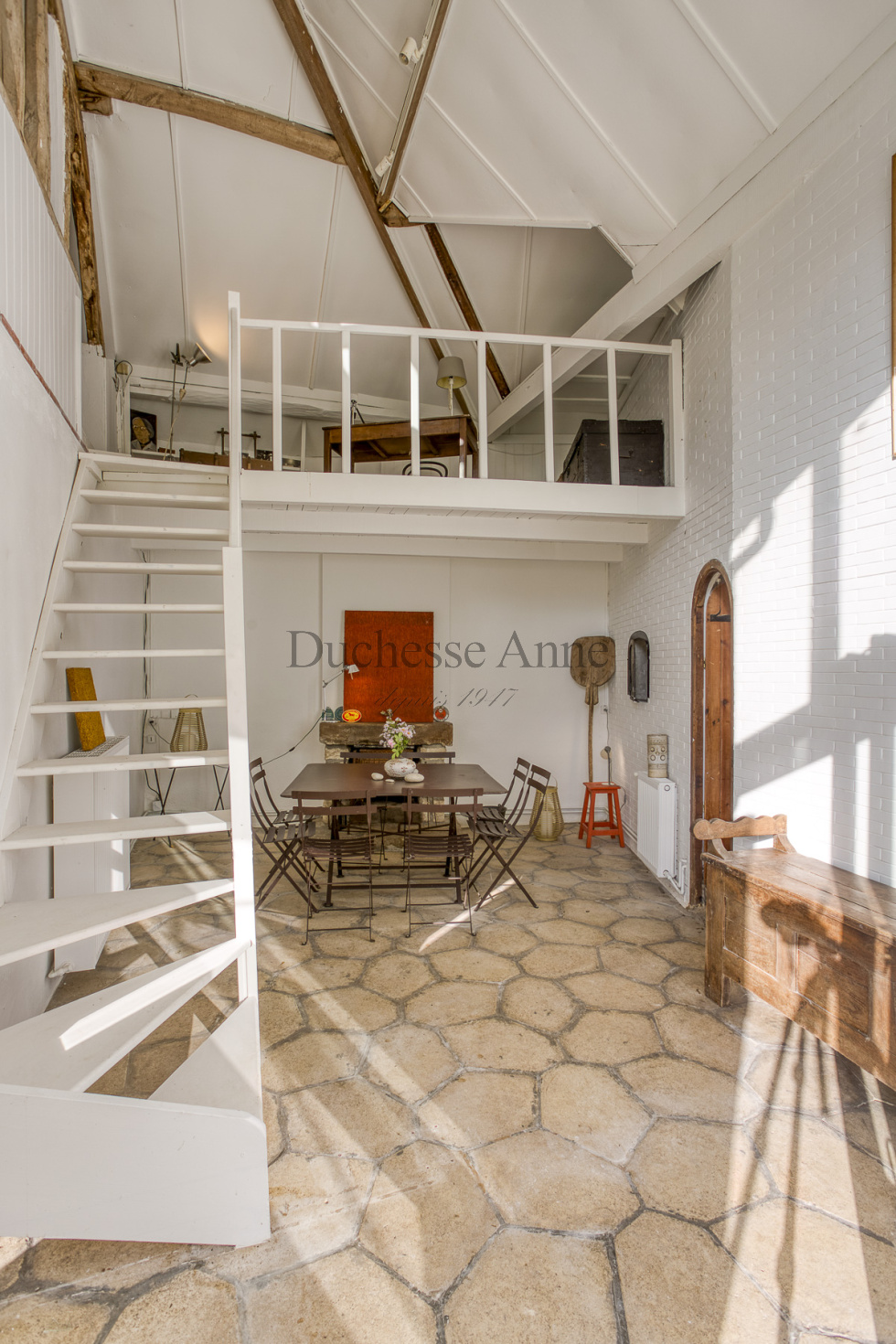 Entrée principale, plusieurs espaces de réception dont une pièce avec verrière et hauteur sous plafond remarquable, cuisine, seconde entrée, charmant atelier de peinture, salle d'eau et wc. A l'étage : palier, chambre et une pièce pour un possible dressing.