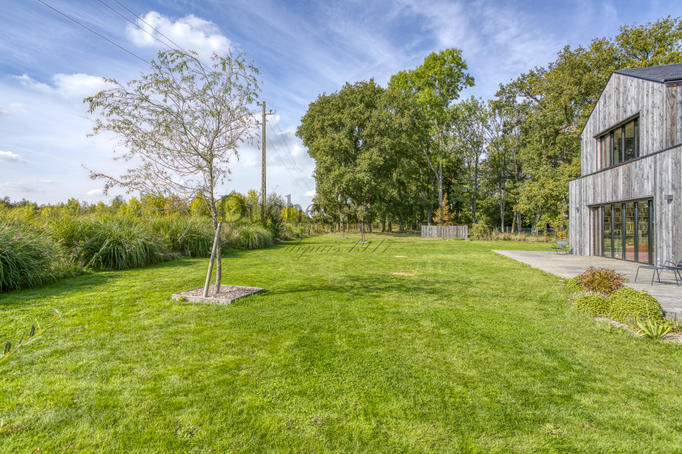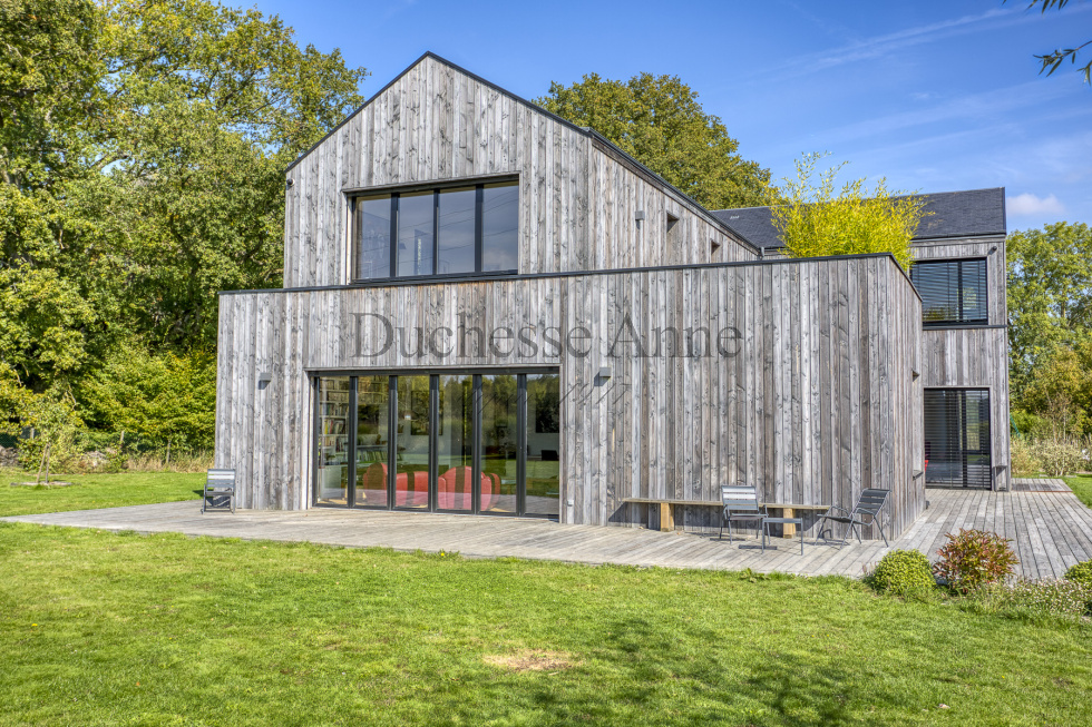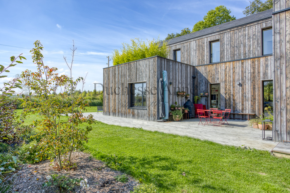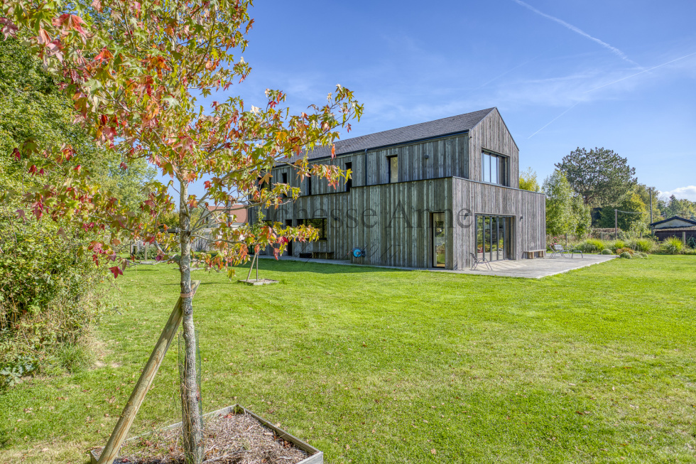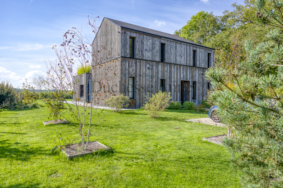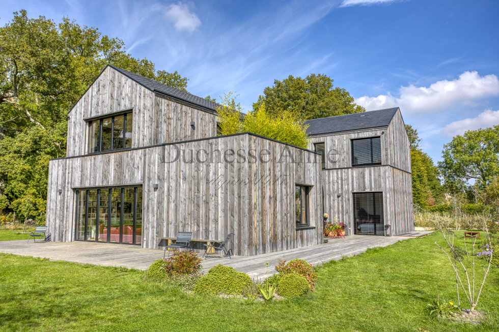 A quelques Minutes de Montfort L'Amaury, Maison contemporaine d'environ 265 m², à ossature bois et de type passive, sur un terrain plat et arboré de 2 281 m² avec vue dégagée sur la campagne et la forêt.