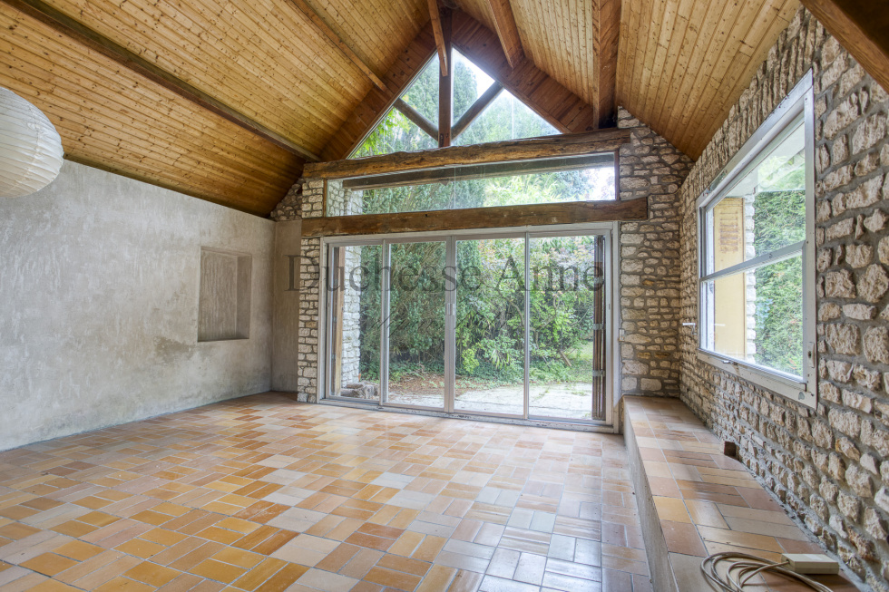 Entrée, wc invités, espace buanderie et salle de bains, 2 chambres de plain-pied, cuisine, séjour principal avec cheminée et salon d'hiver cathédral et vitré vers la terrasse et le jardin, ou vaste espace de réception en réunissant les 2 salons.
