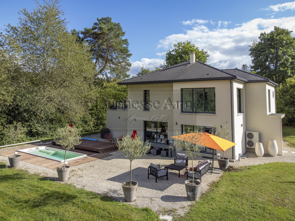 À seulement quelques minutes de Montfort-l’Amaury, nichée dans un écrin de verdure en pleine nature, maison contemporaine et d'exception construite en 2018, alliant élégance, confort moderne et tranquillité absolue. Surface habitable généreuse avec de grands volumes baignés de lumière grâce à de larges baies vitrées et nombreuses. Prestations haut de gamme : matériaux de qualité, finitions soignées, équipements modernes… Entrée avec vestiaire et wc invités, espace de réception ouvert et convivial, idéal pour les réceptions et la vie de famille, avec magnifique séjour avec vues dégagées sur le jardin, la forêt, et cuisine ouverte entièrement équipée d’électroménager de qualité et très grande hauteur sous plafond, suite parentale de plain-pied comprenant chambre, salle d’eau et wc. Accès à l’étage par un escalier béton très aérien car suspendu qui lui confère une apparence légère, palier mezzanine avec espace bureau, wc séparés, chambre, suite parentale exceptionnelle comprenant une vaste chambre, un très beau dressing, une salle de bains avec vue sur le parc et une terrasse spacieuse. Sous-sol dont la première partie est entièrement dédiée à un véritable espace de relaxation et massage avec une empreinte asiatique et zen. Salle de jeux/billard, pièce technique comprenant la buanderie et la pompe à chaleur, grande cave et espace de stockage. Grande dépendance avec 4 stationnements pour véhicules en intérieur, espace atelier, stockage... Terrain arboré de plus de 8 100 m² offrant intimité et sérénité. Piscine-spa avec nage à contre-courant chauffée et sécurisée par un deck en bois et coulissant, parfaite pour profiter des beaux jours et de moments de relaxation. Environnement calme, sans vis-à -vis, idéal pour les amoureux de la nature. Cette propriété rare sur le secteur vous séduira par sa lumière omniprésente, son cadre verdoyant, et sa proximité immédiate de Montfort-l’Amaury, une charmante commune réputée pour son patrimoine, ses commerces, ses écoles et ses accès rapides vers Paris.
