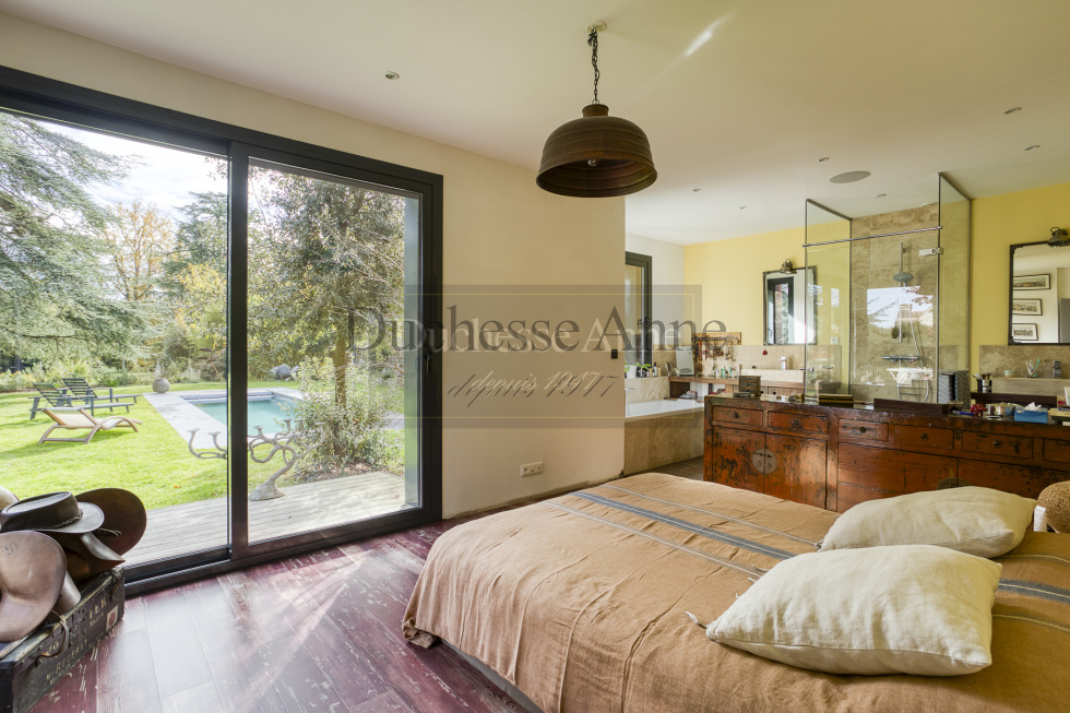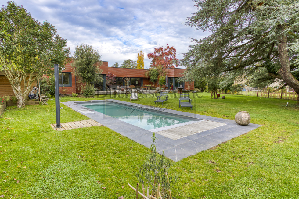 Belle propriété contemporaine construite il y a tout juste 10 ans au sein d’un parc de 3050 m² environ à l’abri des regards derrière un grand mur en pierre.