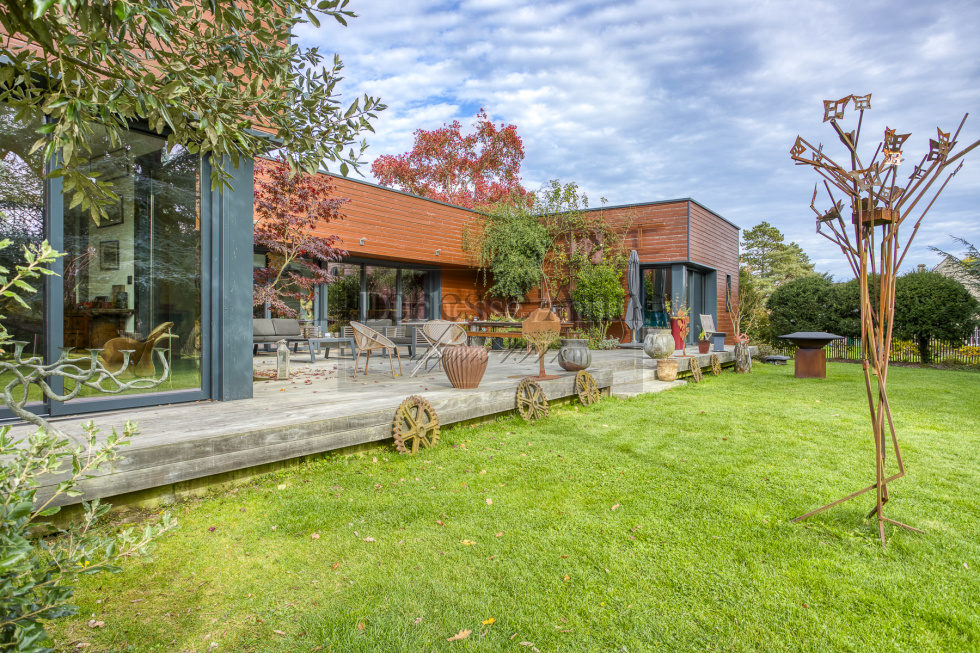 Maison de 200 m² environ, à toit plat et végétalisé, entièrement de plain-pied, aux normes énergétiques actuelles (DPE en A), avec pompes à chaleur et chauffage au sol assurant un parfait confort et avec de nombreuses ouvertures vitrées vers le parc boisé.