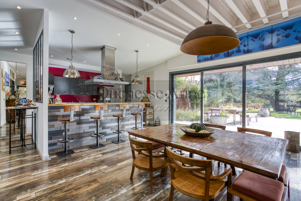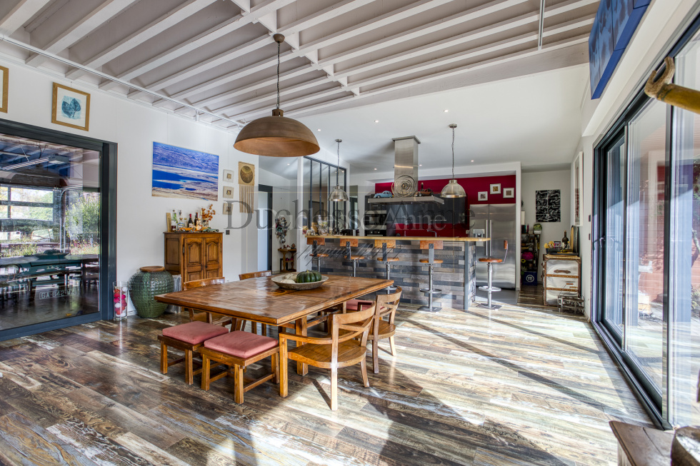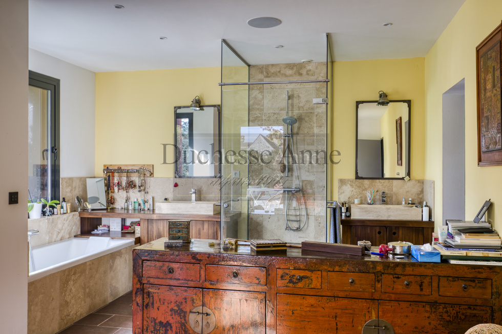 Entrée avec espace vestiaire et technique (cellier, buanderie…), wc, espace de réception hors normes sur plus de 80 m² entièrement ouvert (salon et cuisine) avec cheminée et bel hauteur sous plafond, grand espace parental de plus de 45 m² dans une aile indépendante (chambre, bureau, dressing, salle de bains et wc). Les enfants et amis sont l’autre aile, à l’écart, avec 3 chambres, salle d’eau, salles de bains et wc.
