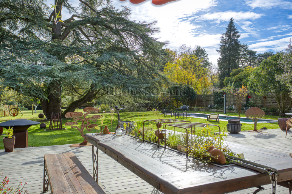 Magnifique terrain arboré et paysagé, cour d’accueil, espace potager et arbres fruitiers, grande terrasse de 100 m² donnant sur les espaces de réception, en pleine nature et vers la piscine type couloir de nage.