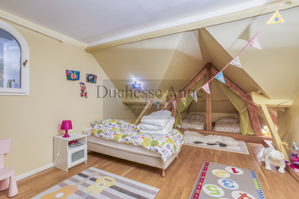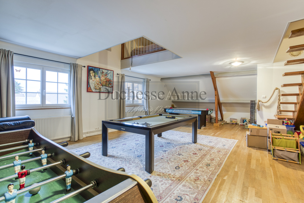 Maison principale (320 m² environ). Entrée avec dégagements et nombreux placards-vestiaires, wc, salle de jeux et tv, cuisine, séjour spacieux (plus de 50 m²) avec cheminée et bénéficiant de beaucoup de clarté avec l'extension verrière. Ancien garage transformé en espace de rangement et buanderie, chambre de plain-pied, salle de bains (baignoire et douche) et bureau. A l’étage, grande salle de jeux de près de 70 m², wc, dégagement vers 2 chambres, 2 salles de bains avec wc, salle d'eau et un bel espace dortoir pour enfants. Sous combles, dortoir supplémentaire et possible grenier à aménager. Maison avec grand sous-sol (cave...).
