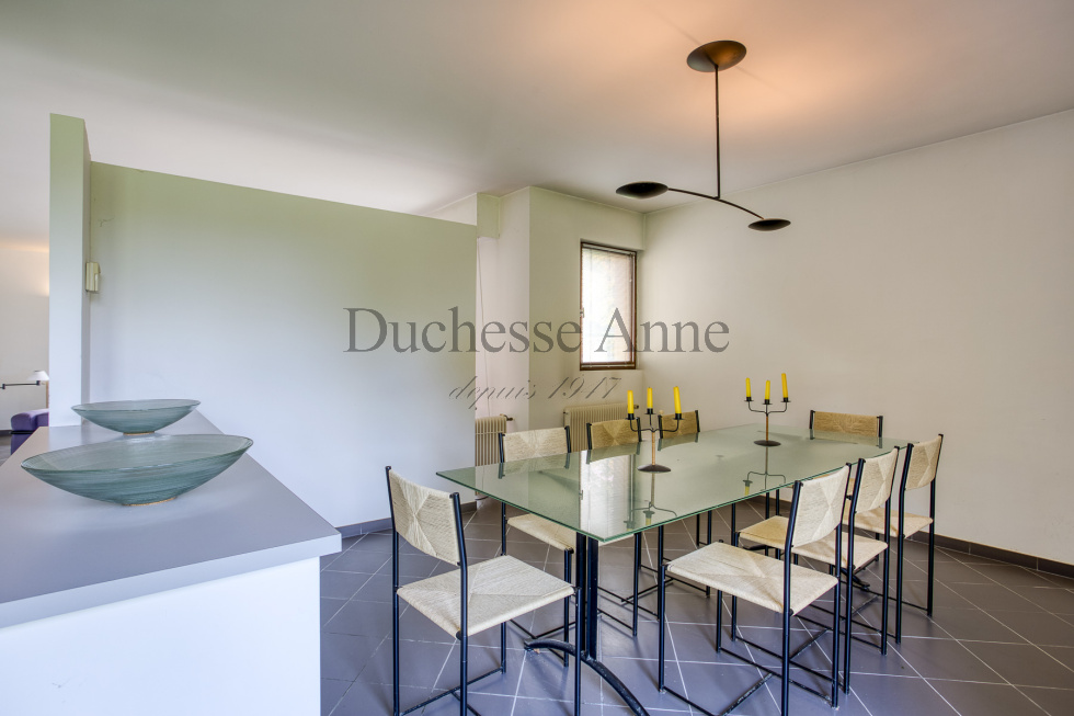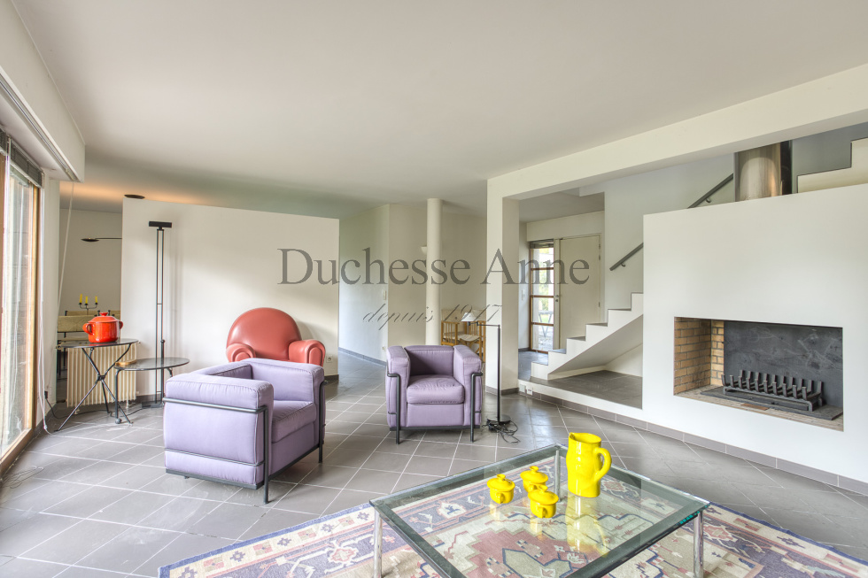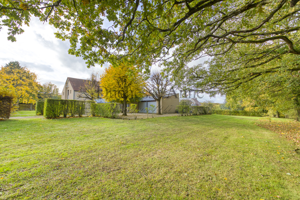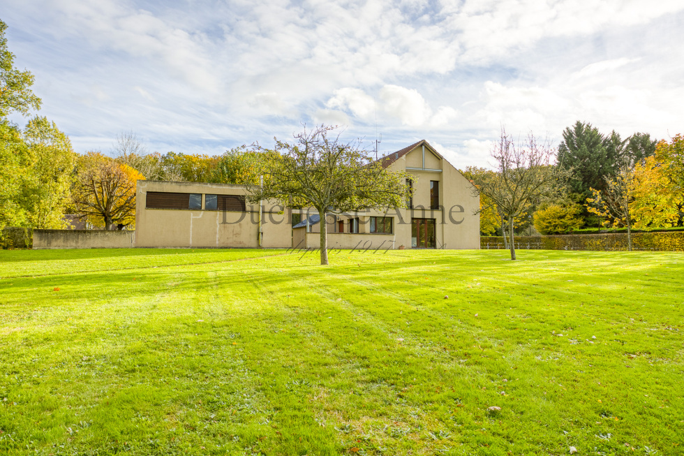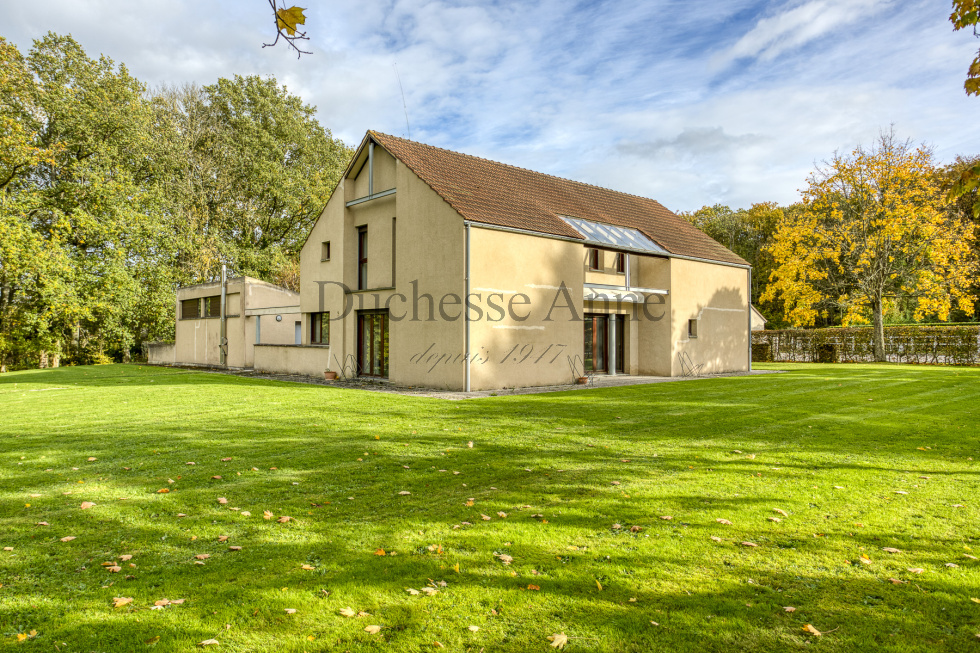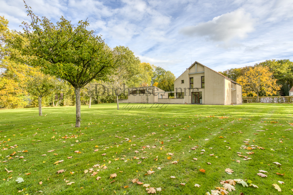 Montfort l'Amaury, dans domaine privé en lisière de forêt domaniale, maison d'architecte de 1985 lumineuse: entrée sur séjour avec cheminée 36 m², salle à manger 20 m², cuisine indépendante ouvrant sur terrasse aménagée en patio,bureau, dégagement avec placards, buanderie, salle d'eau avec wc, chambre. A l'étage, palier desservant la chambre parentale avec dressing, salle de bains et wc, dégagement, 2 chambres, dressing, salle de bains, wc. Garage pour 2 voitures en dépendance, chaufferie, cellier. Au calme absolu.
