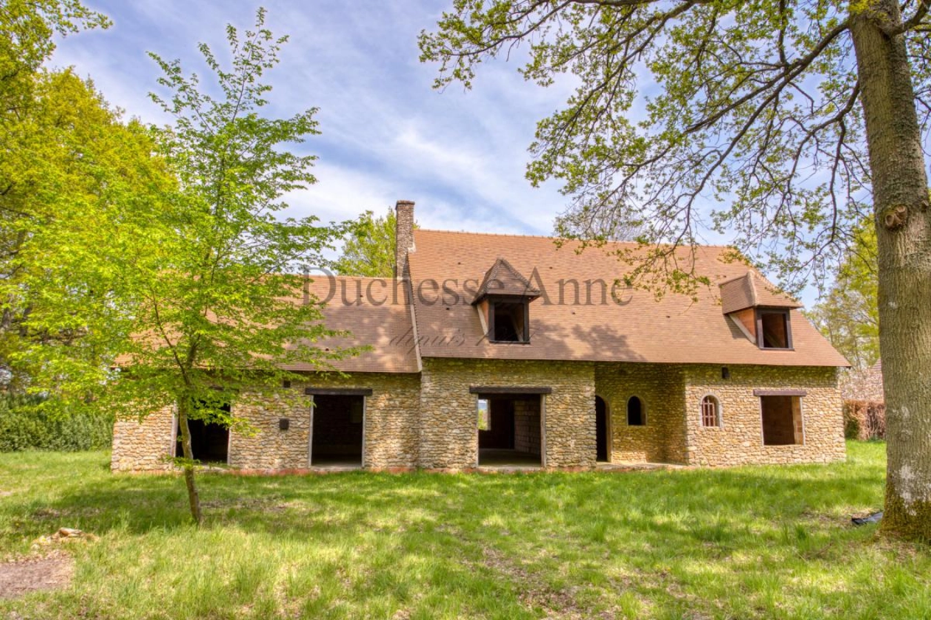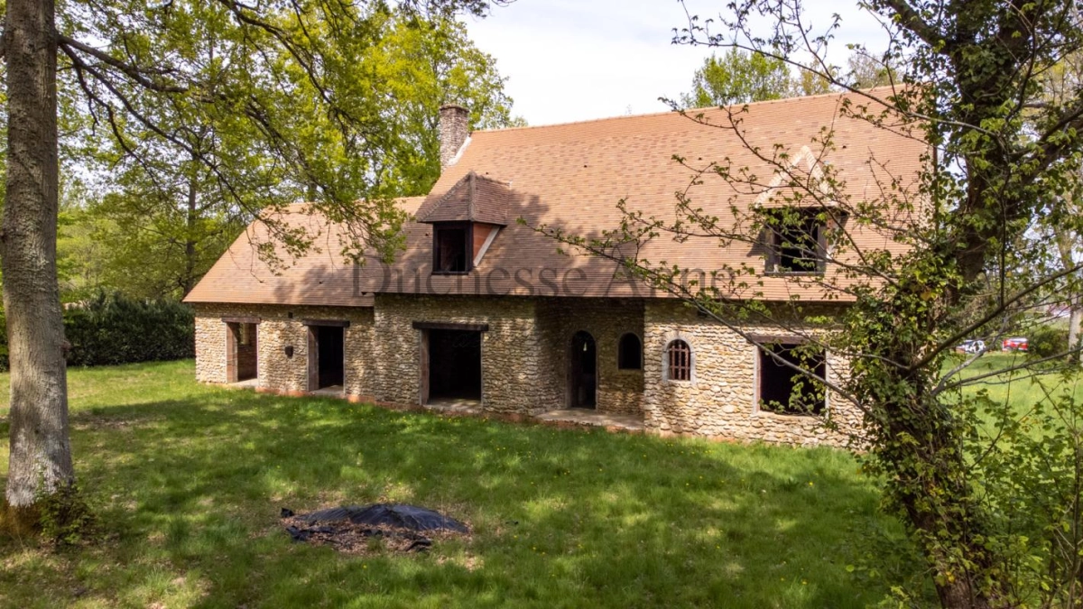 Maison de charme d'environ 300 m2 entièrement construite avec des matériaux anciens à finir d'aménager sur un terrain d'environ 2,5 hectares arboré de chênes centenaires. Au rez de chaussée, une belle entrée dessert un salon d'environ 50 m2 avec une mezzanine , une salle à manger d'environ 50 m2, une cuisine, une salle de bains et une chambre. A l'étage, un pallier amène à deux ou trois chambres avec une salle de bains. Possibilité d'aménager le troisième niveau en 2 chambres et une salle d'eau. Sous-sol total composé d'un garage, de diverses pièces de rangement. La Propriété est à viabiliser. Exposition Sud-Ouest. Accès forêt à pieds. Travaux à finir. Rare ! Les informations sur les risques auxquels ce bien est exposé sont disponibles sur le site Géorisques : www.georisques.gouv.fr